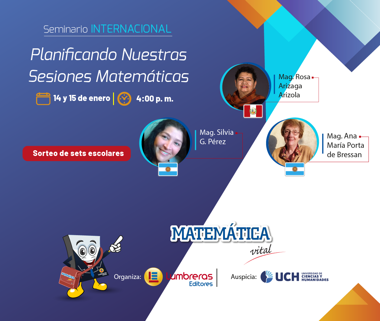 Desde nuestro campo, consideramos importante ofrecer a los docentes un panorama sobre la planificación de clases, por eso, Lumbreras Editores con auspicio de la Universidad de Ciencias y Humanidades (UCH) presentará este seminario internacional los días viernes 14 y sábado 15 de enero de 2022 de 4:00 p. m. a 6:00 p. m., el cual será transmitido a través de la fanpage Lumbreras Escolar y vía Zoom. El seminario será completamente gratuito y contará con certificación a nombre de la UCH.