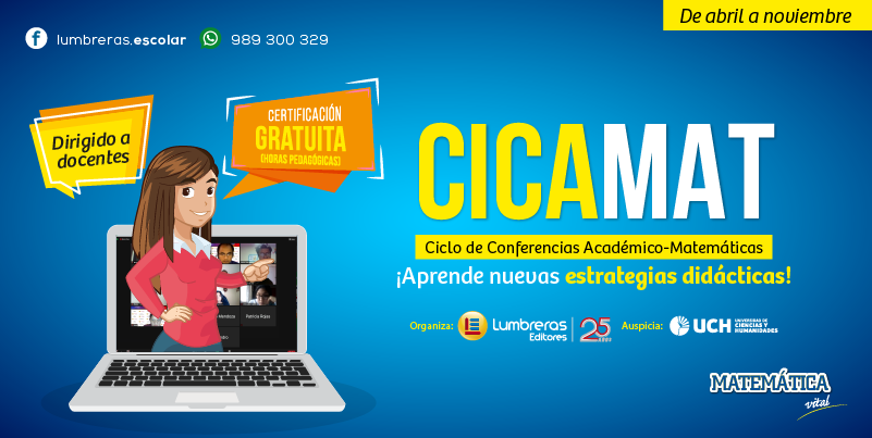 Como gestores de la educación en nuestro país, consideramos importante continuar reforzando los conocimientos entre los docentes con temas académicos que aborden las competencias en el área de Matemáticas para la enseñanza-aprendizaje, ya sea de forma presencial, virtual o mediante el modelo híbrido a nivel de la Educación Básica Regular; por eso, Lumbreras Editores con el auspicio de la Universidad de Ciencias y Humanidades (UCH) presenta el «Ciclo de Conferencias Académico-Matemáticas» (CICAMAT) para los docentes del área de Matemáticas de primaria y secundaria de nuestro país. Las fechas en las cuales se desarrollarán las presentaciones son: