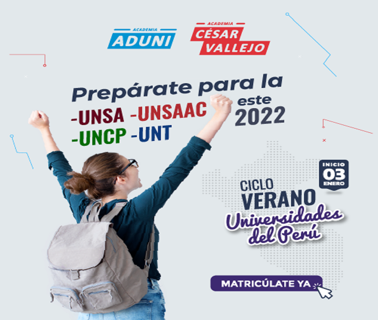 Las academias Aduni y César Vallejo agregan a su propuesta de formación integral para jóvenes postulantes, los nuevos ciclos Verano para las universidades de Trujillo, Cusco, Huancayo y Arequipa, que han sido desarrollados de acuerdo al perfil académico de cada universidad y la estructura de los cursos que solicita cada centro de estudio. Este nuevo proyecto empezará en enero del próximo año 2022.