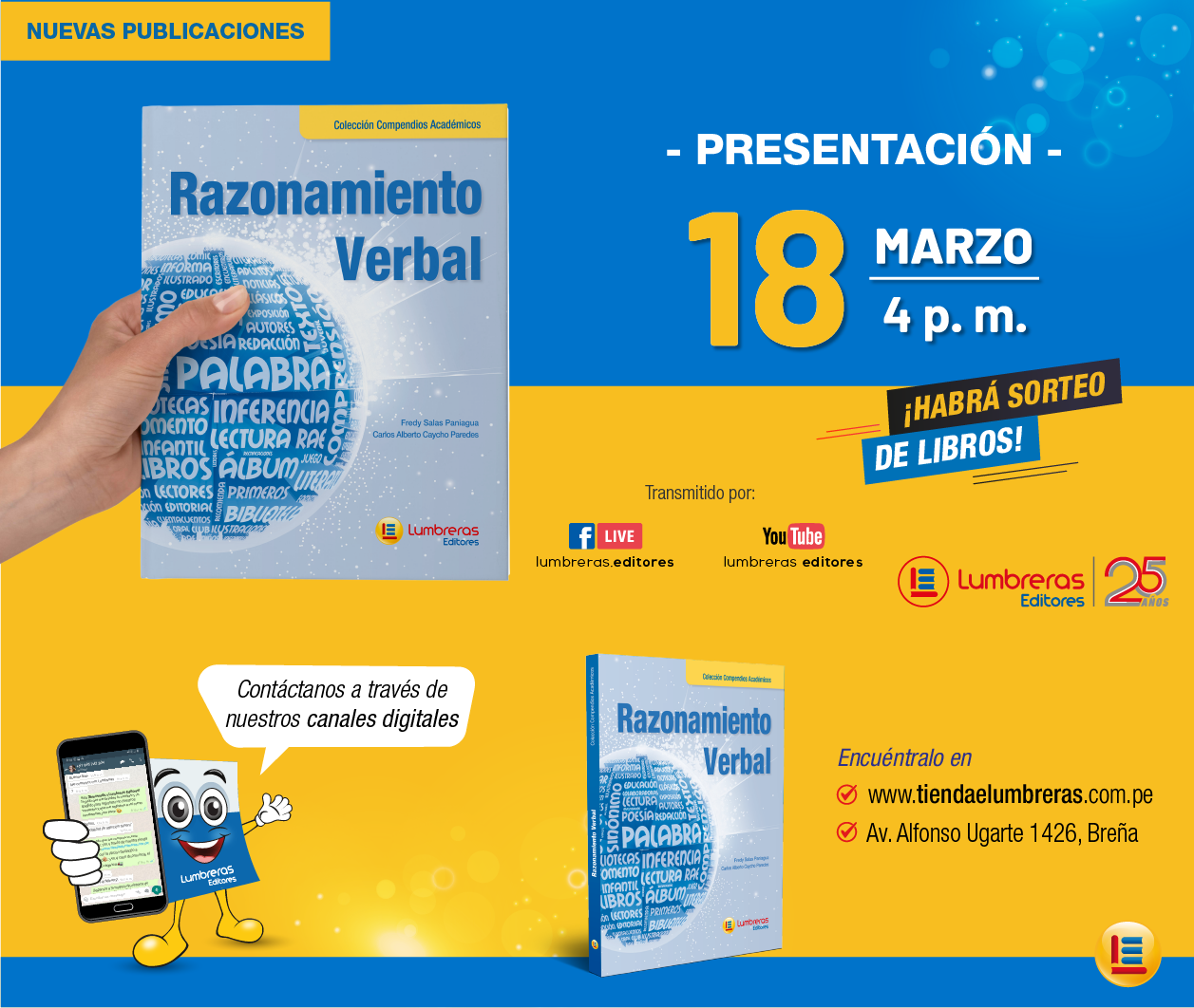 Se requiere de repaso y reforzamiento constante con el material educativo pertinente para enfrentarse a un examen de admisión, principalmente de los cursos que son clave en el puntaje y lograr esa anhelada vacante. En momentos donde distintas casas de estudio están llevando a cabo sus pruebas de examen de admisión, y otras están a puertas de realizarlas, cobra mayor importancia la preparación académica de miles de estudiantes. Por eso, Lumbreras Editores se suma a través de la elaboración de sus materiales preuniversitarios a contribuir con este fin, por lo cual organizará la presentación de su más reciente publicación: Compendio Académico de Razonamiento Verbal, en el mes de marzo de 2022.