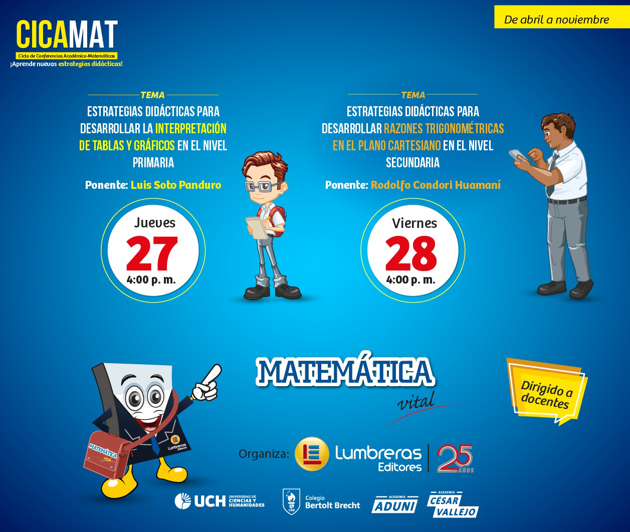Como gestores de la educación en nuestro país, consideramos importante continuar reforzando los conocimientos entre los docentes con temas académicos que aborden las competencias en el área de Matemáticas para la enseñanza-aprendizaje, ya sea de forma presencial, virtual o mediante el modelo híbrido a nivel de la Educación Básica Regular; por eso, Lumbreras Editores con el auspicio de la Universidad de Ciencias y Humanidades (UCH) presenta el «Ciclo de Conferencias Académico-Matemáticas» (CICAMAT) para los docentes del área de Matemáticas de primaria y secundaria de nuestro país. Las fechas en las cuales se desarrollarán las presentaciones son: