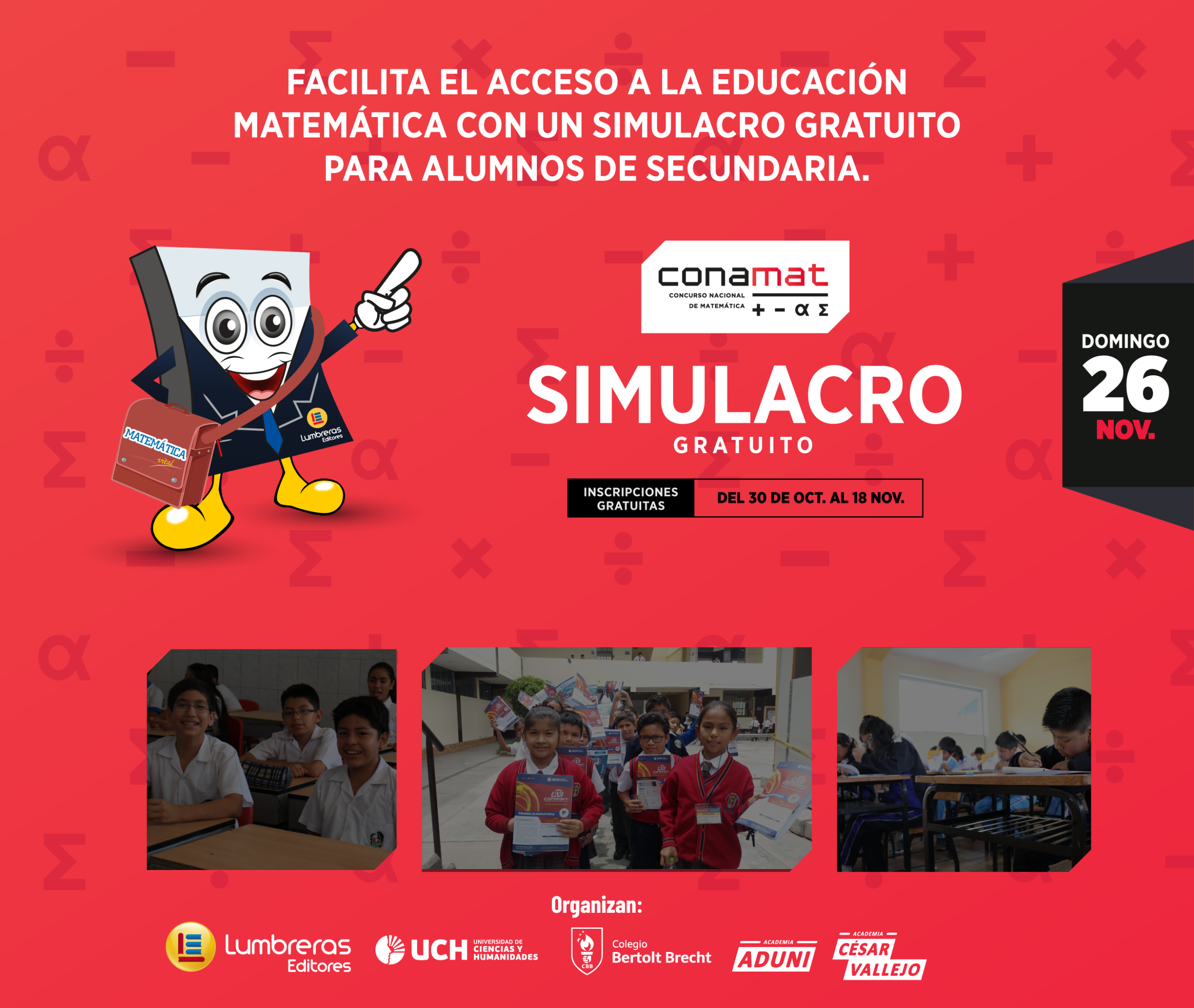 El simulacro gratuito se llevará a cabo el próximo 26 de noviembre y pueden participar estudiantes de 1ro a 5to de secundaria de colegios públicos y privados. Es una actividad previa a la 23 edición del CONAMAT y está motivado por el gran interés de la comunidad educativa por participar este año de una competencia de matemática, que ayude a los colegios y profesores a evaluar el avance de sus estudiantes en el área de matemática; y para familiarizar a los participantes con los cambios que se vienen implementando para las nuevas ediciones del próximo evento del CONAMAT 2024.