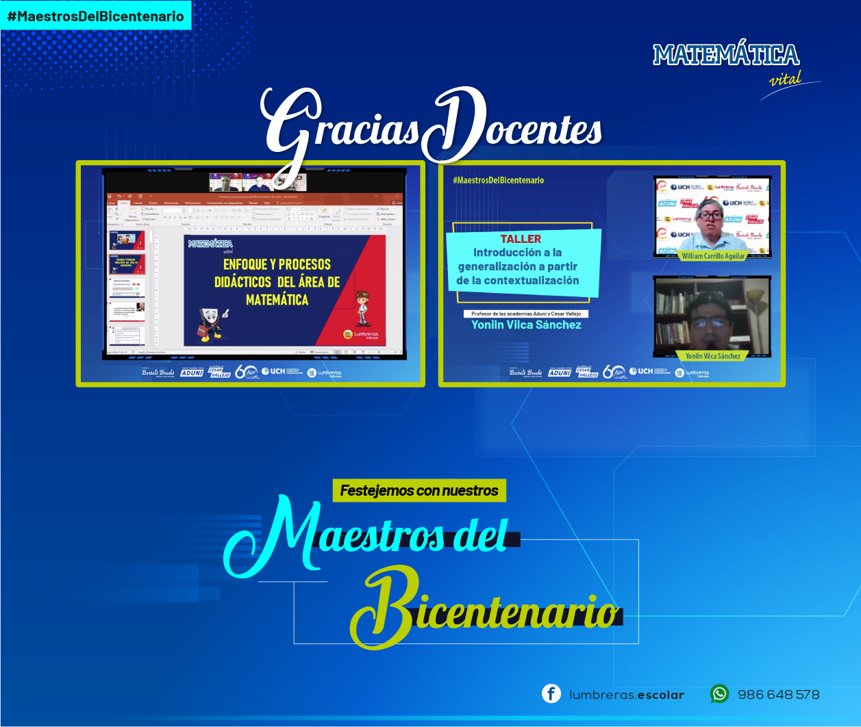 La labor de un docente resalta por su responsabilidad, compromiso, paciencia, vocación y dedicación en la formación de generaciones de estudiantes con conocimientos sólidos y valores. Además, somos conscientes del esfuerzo de miles de profesores en estos tiempos difíciles, ya que muchos de ellos tuvieron que reinventarse y aprender nuevas formas de enseñanza con recursos digitales en esta etapa de la educación virtual. Por eso, Lumbreras Editores organizó una serie de actividades en conmemoración a nuestros llamados “maestros del bicentenario”. Las capacitaciones y sorteos se realizaron mediante zoom y a través de medios digitales como la fanpage Lumbreras Escolar y el canal de YouTube de Lumbreras Editores.