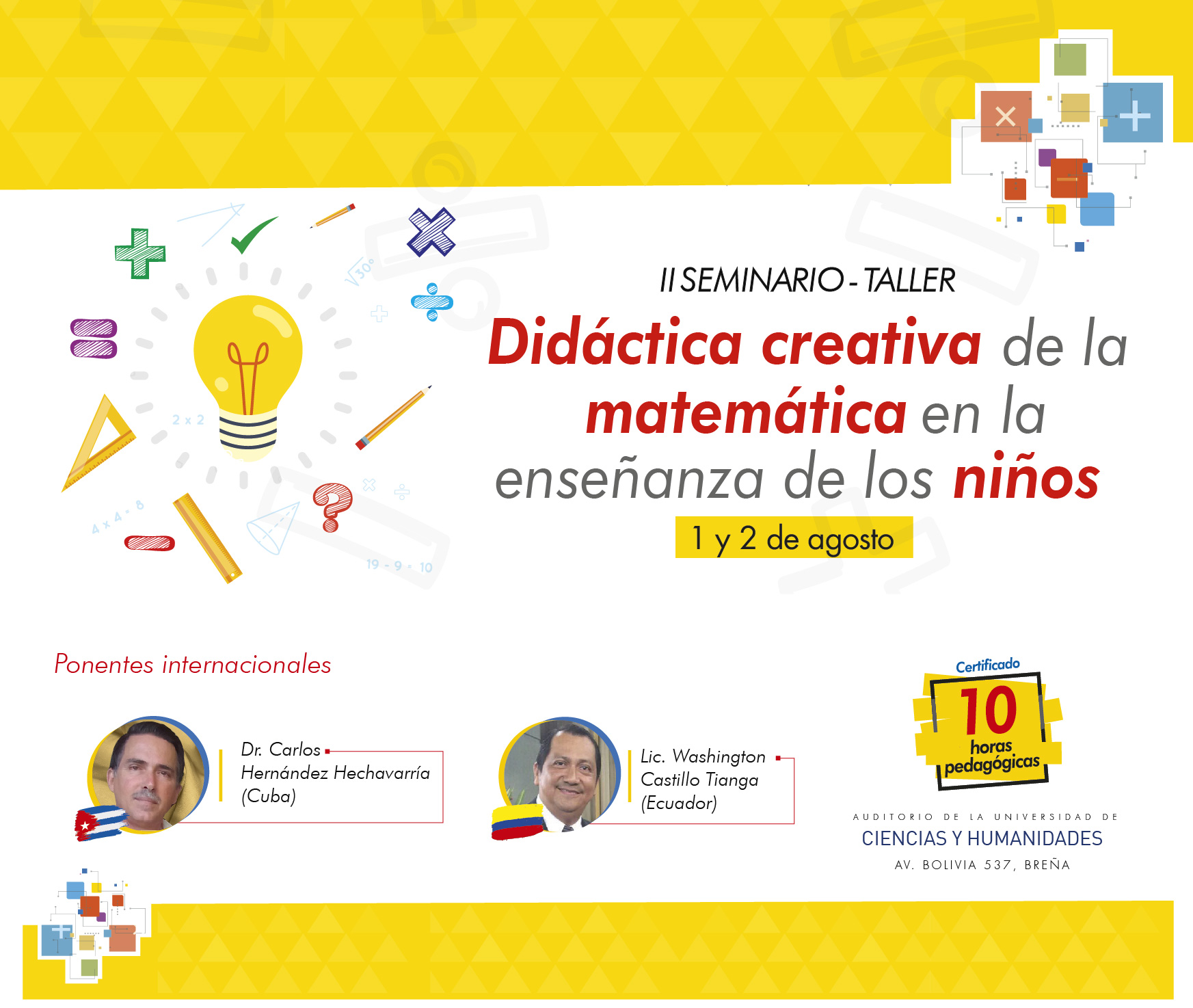 Contará con la participación de dos destacados ponentes internacionales, el Dr. Carlos Hernández Hechavarría (Cuba), quien comentará sobre “Didáctica creativa de la matemática en la enseñanza de los niños”, y el Lic. Washington Castillo Tianga (Ecuador), quien hablará sobre “Programación neurolingüística aplicada a la enseñanza lúdica de la matemática”. Asimismo, se desarrollarán talleres por cada grado y se entregarán certificados por 10 horas pedagógicas.