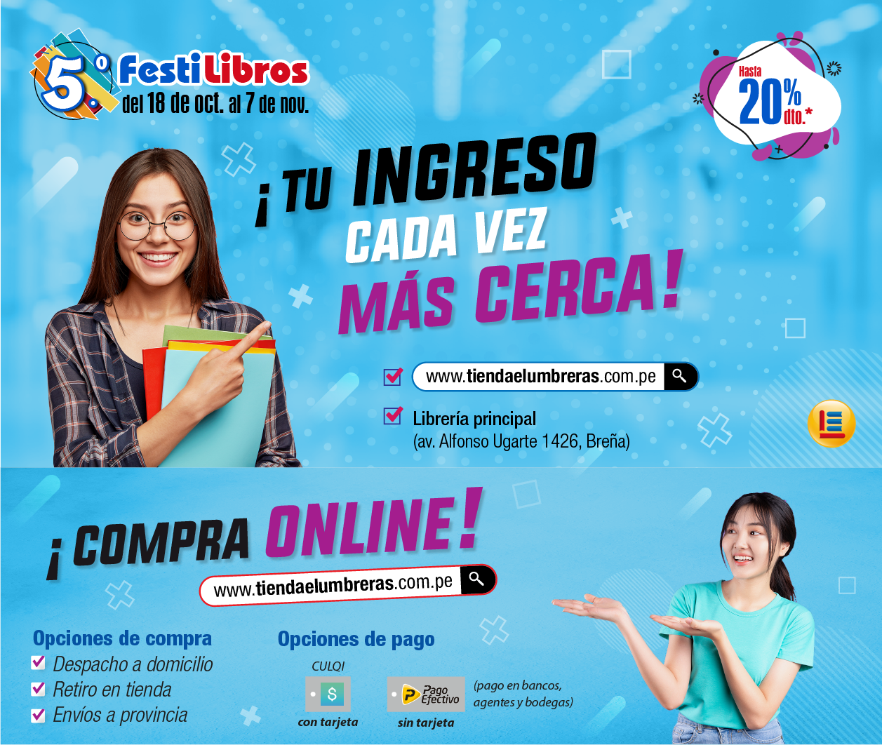 Los precios de promoción por FestiLibros son válidos para compras en tienda virtual www.tiendaelumbreras.com.pe, donde podrás elegir la opción despacho a domicilio o recojo en tienda; y de forma presencial en la librería principal, que está ubicada en av. Alfonso Ugarte 1426, Breña. Si realizas tu compra con la modalidad retiro en tienda, entonces debes tener en cuenta los siguientes horarios de atención en librerías para efectuar tu recojo, además, se debe comprar con 48 horas de anticipación como mínimo.