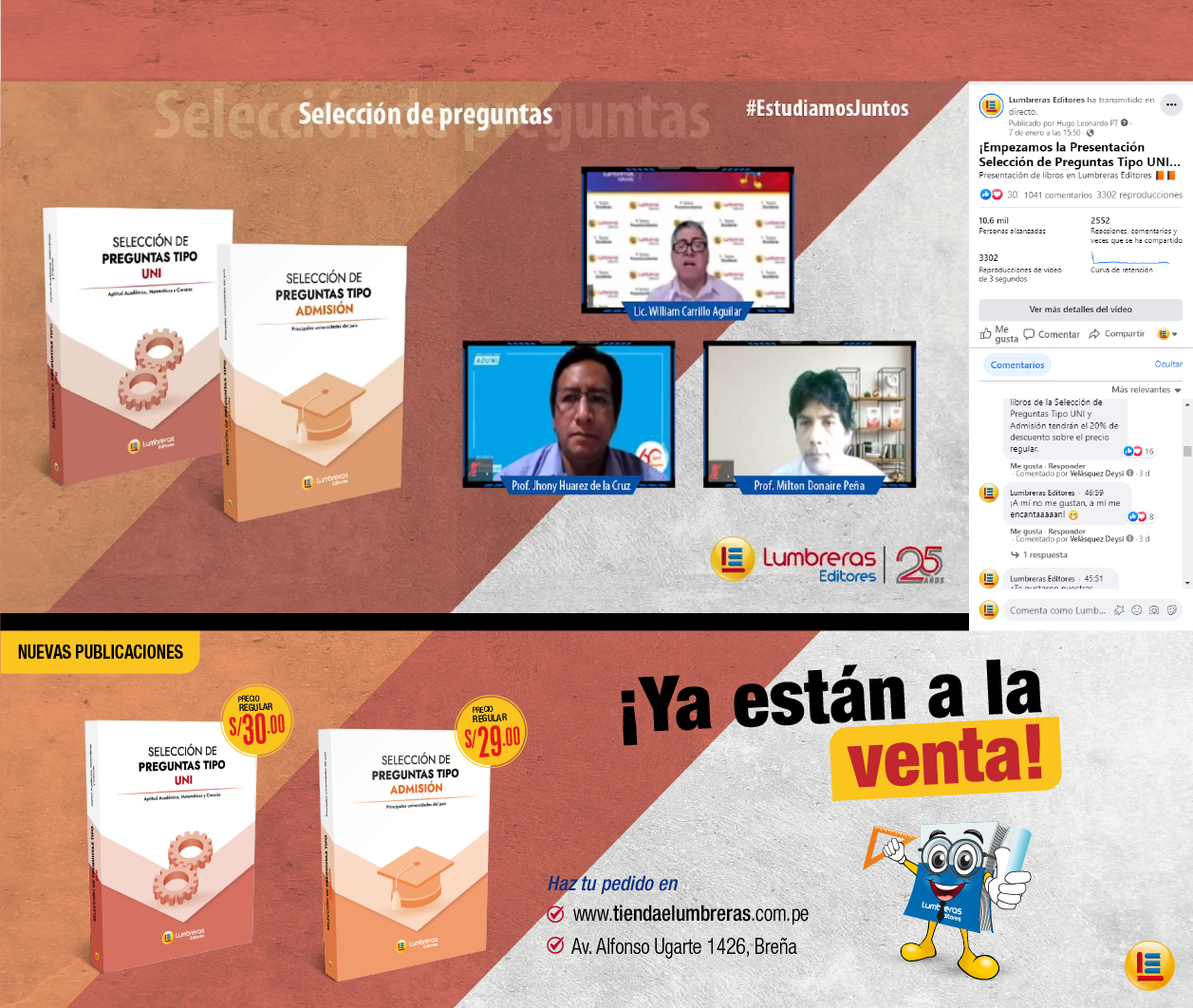 La presentación de estos textos se realizó el viernes 7 de enero a las 4:00 p. m. a través de las páginas de Facebook y YouTube de Lumbreras Editores, y estuvo a cargo de grandes ponentes, especialistas como Jhony Huarez de la Cruz y Milton Donaire Peña. Por otro lado, se premió la participación del público con el sorteo de seis ejemplares de los libros en mención. Además, se lanzó una promoción para adquirir estas nuevas publicaciones con el 20 % de descuento del 7 al 12 de enero en sus tiendas: librería principal de Av. Alfonso Ugarte 1426, Breña; y de manera virtual en www.tiendaelumbreras.com.pe.