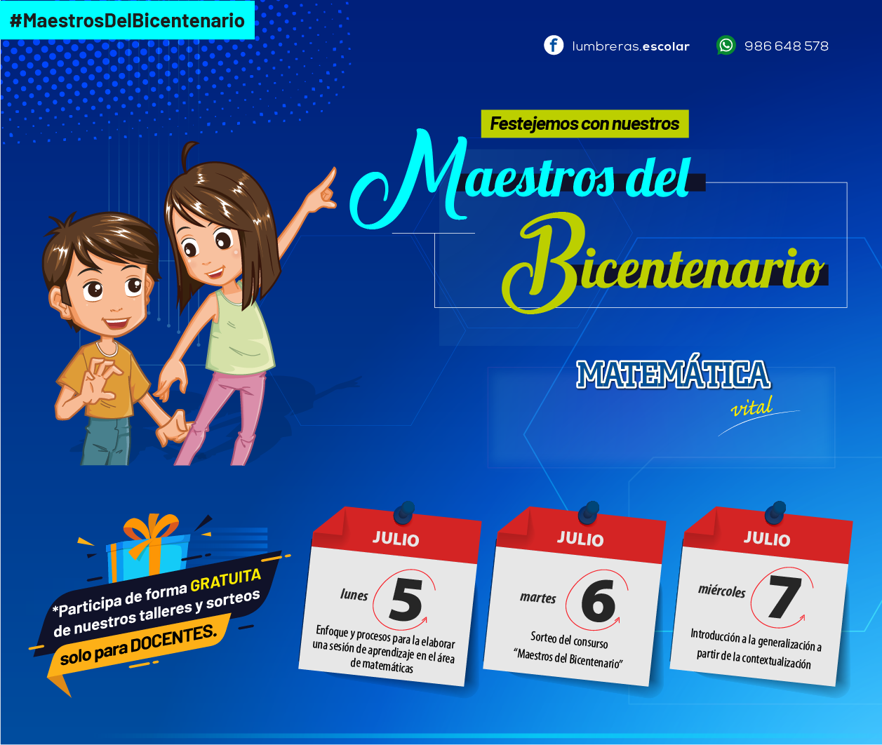 El Día del Maestro que se celebra todos los años, el 6 de julio, tendremos un importante evento, un sorteo exclusivo para docentes, donde se obsequiará textos preuniversitarios, textos escolares de la línea Matemática Vital, maletas, entre otras sorpresas; ello con el fin de sumar con este material al trabajo que realizan los docentes diariamente, porque esta es una labor sin descanso. Los pasos para participar se compartieron por las redes sociales de Lumbreras Escolar.