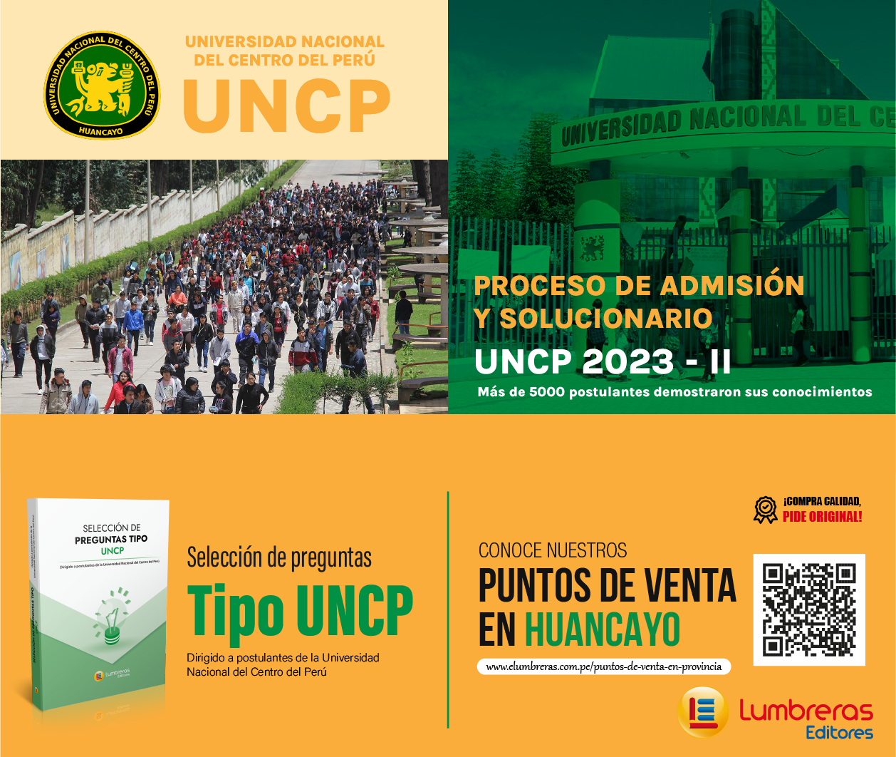 Por otro lado, cabe recordar la presencia de Lumbreras Editores en La incontrastable el pasado mes de julio, donde se presentó el libro Selección de preguntas tipo UNCP, texto que ha sido valioso para la preparación de sus postulantes, ya que refuerza los conocimientos del estudiante respecto a los temas de todos los cursos que vienen en el examen de admisión, mediante la práctica de un considerable número de preguntas propuestas tipo admisión. En el caso de los cursos de matemáticas y ciencias, cuenta además con un problema resuelto demostrativo al inicio de cada tema.