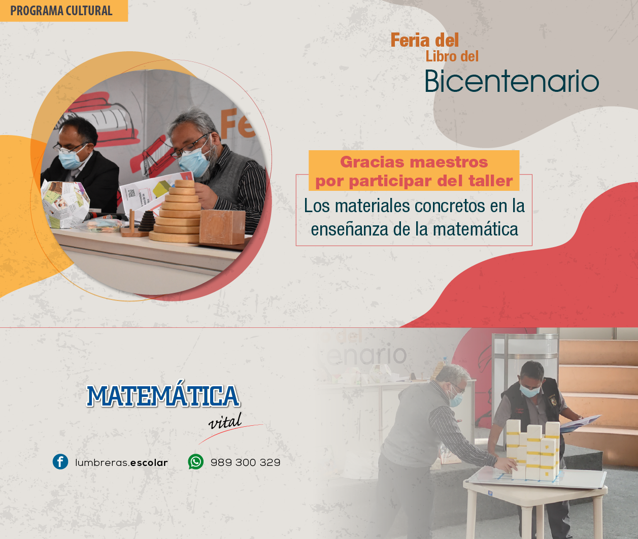 La editorial Lumbreras Editores, con el stand 86 en la Feria del Libro del Bicentenario, se sumó al programa cultural de la feria con el taller “Materiales concretos para la enseñanza de la matemática”, como una capacitación a docentes de Lima y provincias, el pasado viernes 26 de noviembre a las 4:00 p. m. en al auditorio Chabuca Granda del parque Kennedy; y que fue transmitido por la Cámara Peruana del Libro, a su vez, compartido por las páginas Lumbreras Escolar y Lumbreras Editores. El presente taller estuvo a cargo del Lic. Benjamín Tang Fernández, quien planteó la importancia del uso de los materiales concretos y los diferentes tipos de actividades que se pueden realizar a partir de ellos, como la actividad de edificios, torres de Hanoi, origami modular, entre otros. En la palestra, Tang Fernández intercambió ideas con el profesor Juan Esqueche Paiconcial, quien además planteó que en la propuesta escolar Matemática vital hay secciones como “Demuestro mis habilidades” y “Laboratorio matemático” que promueven el uso de dichos materiales.
